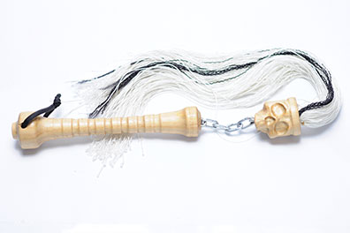 This one of a kind deer bone and wood flogger has 38- 1/2 inch wide x 14 inch long falls for a deep thuddy impact.